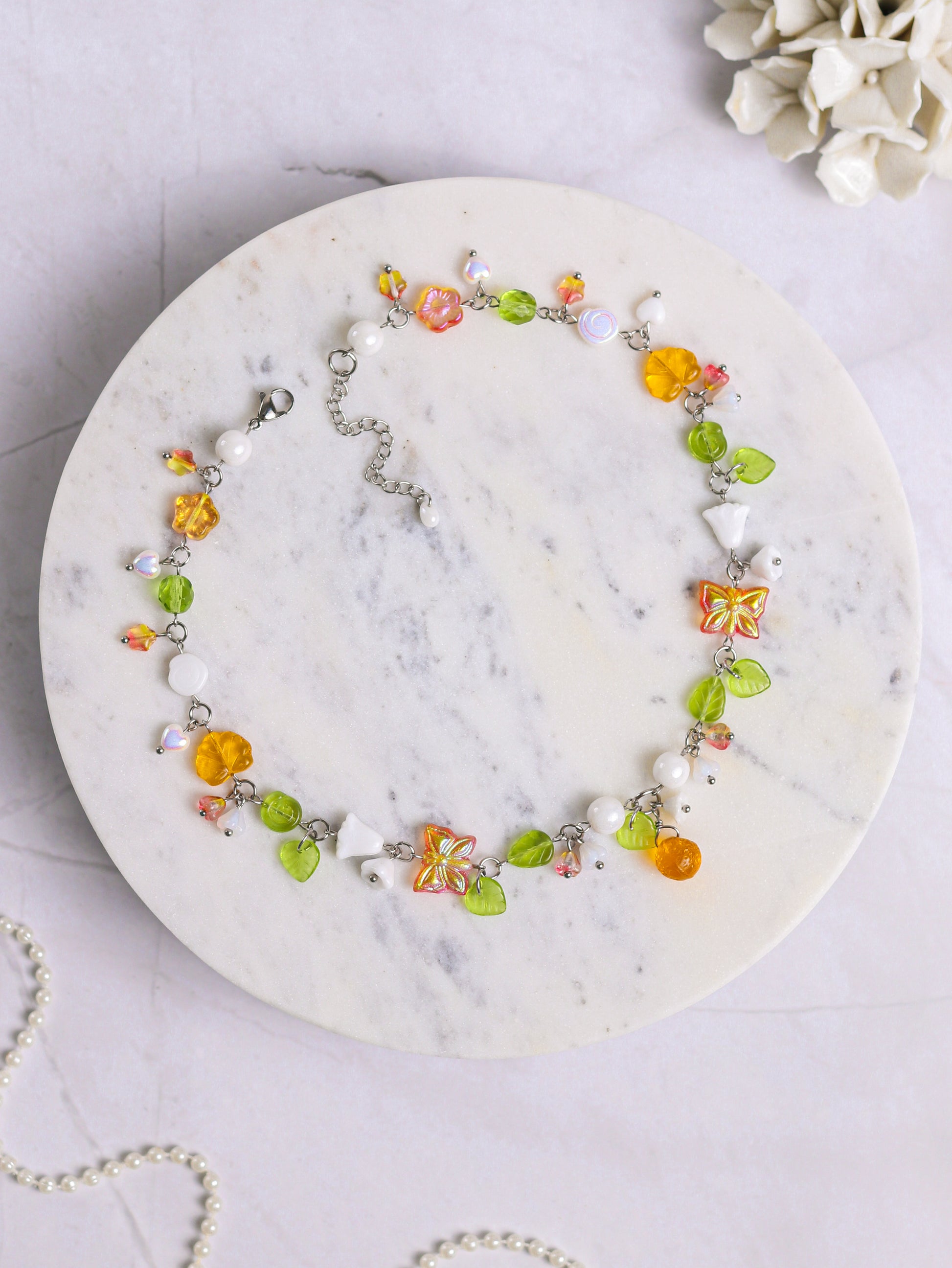 Made with high quality Czech glass beads and glass imitation pearls. The wire and chains are stainless steel (waterproof and tarnish-resistant).