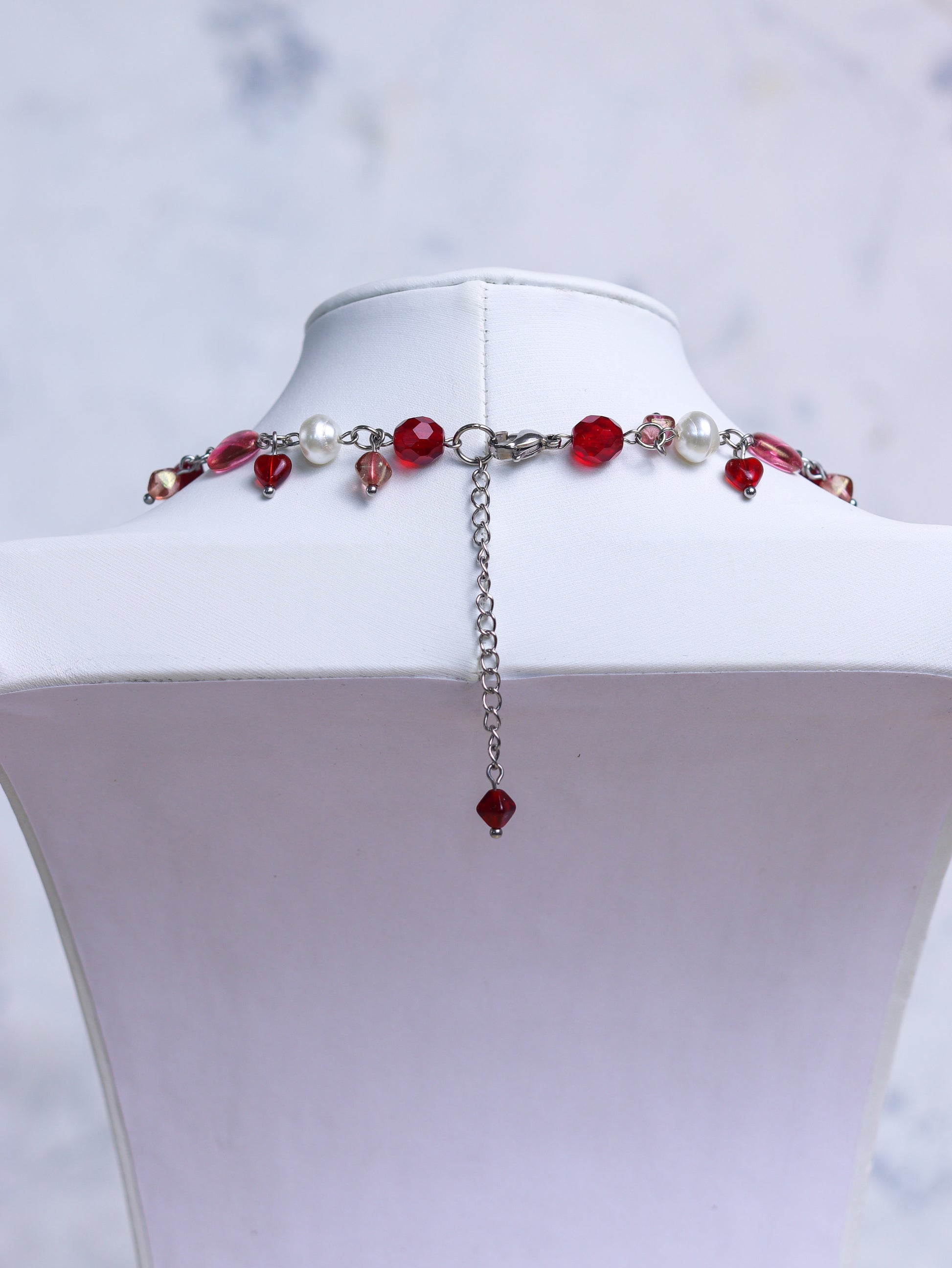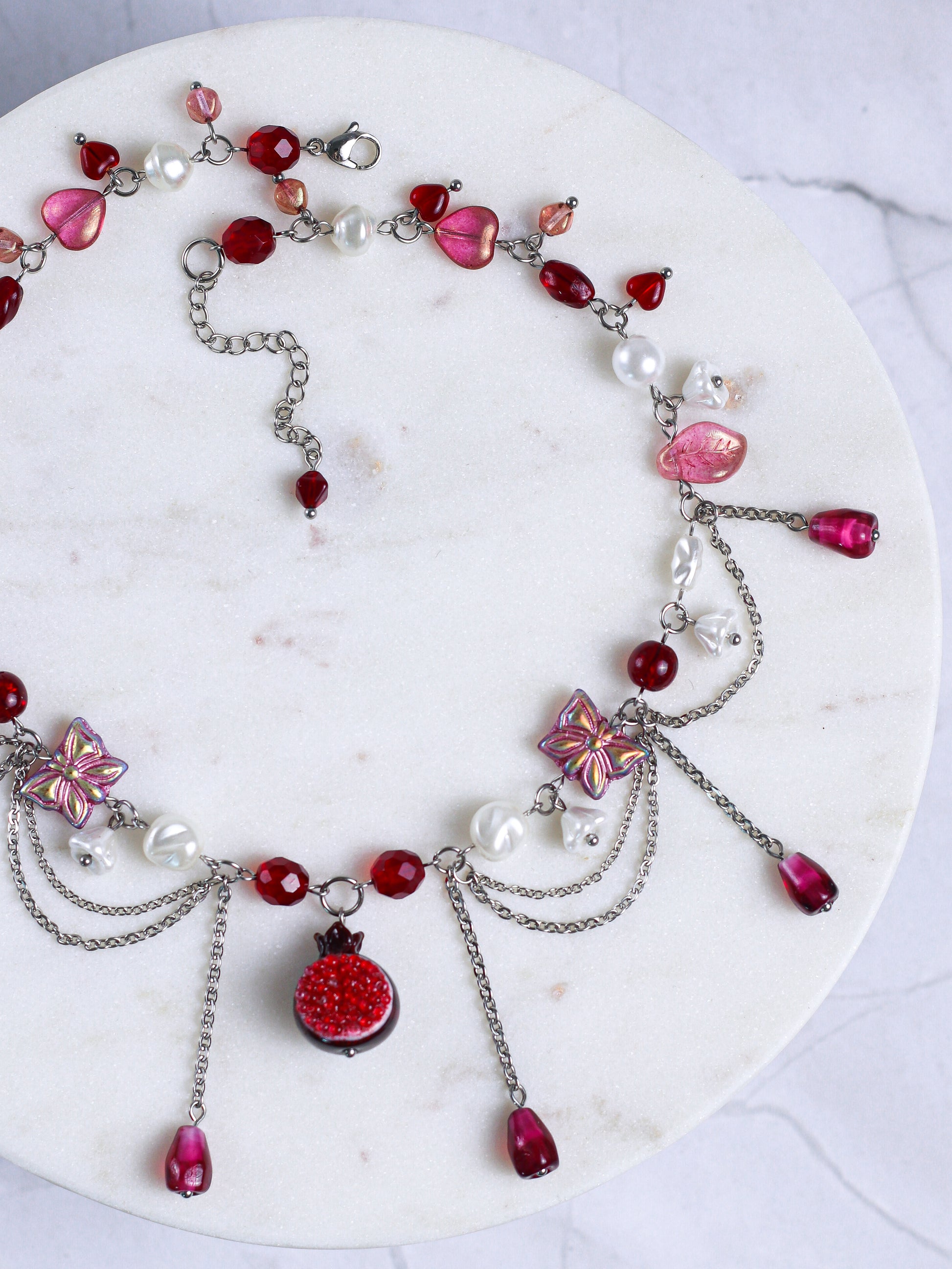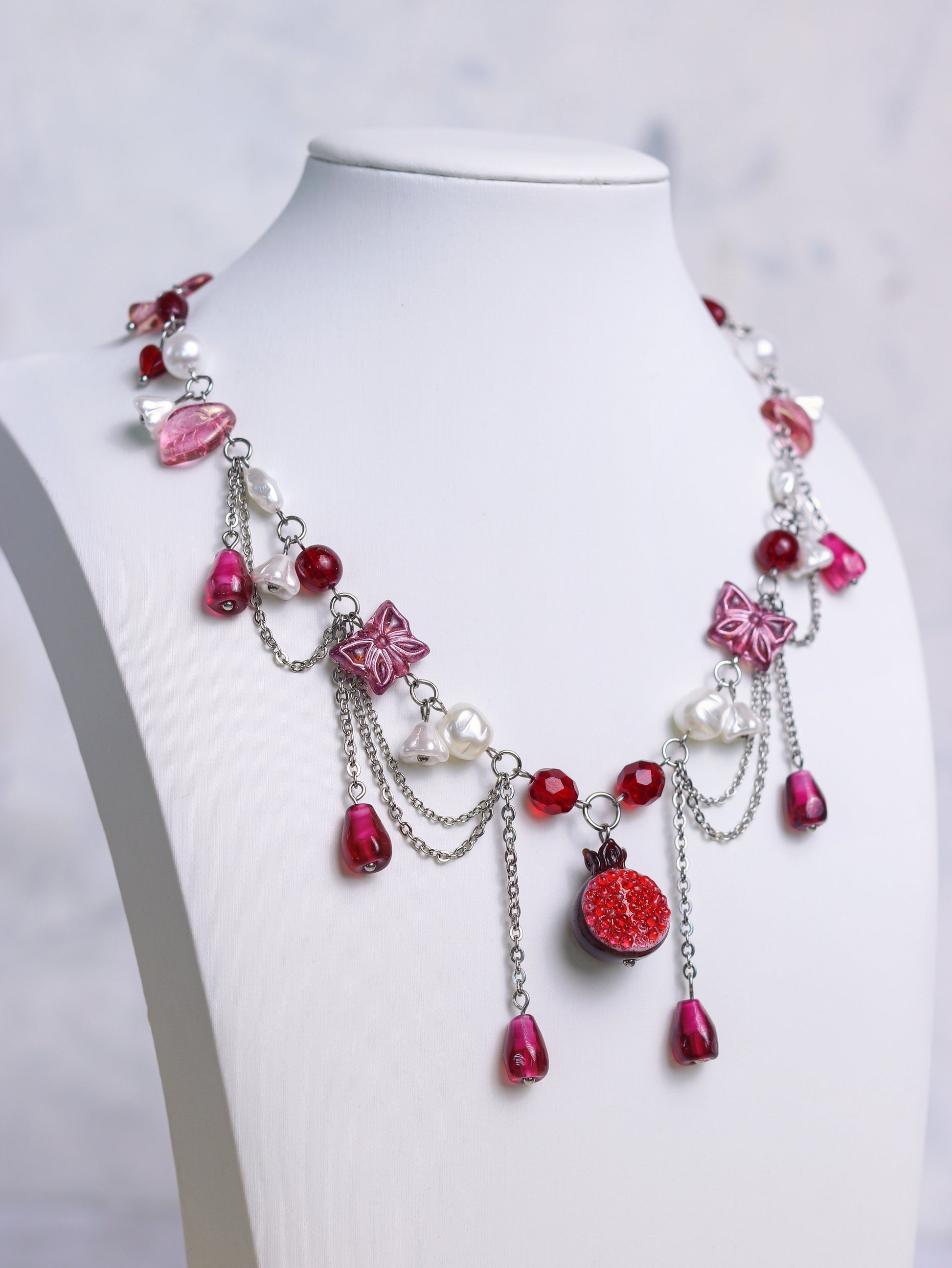 Made with high quality Czech glass beads, glass imitation pearls and handcrafted lampwork pomegranate beads. The wire and chains are stainless steel (waterproof and tarnish-resistant).