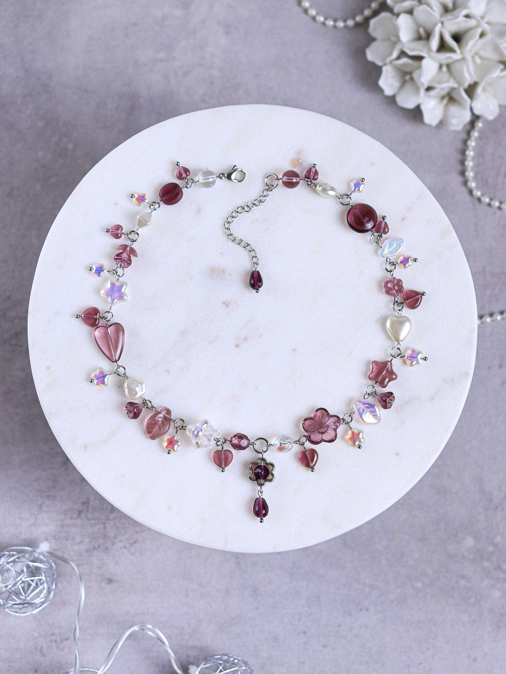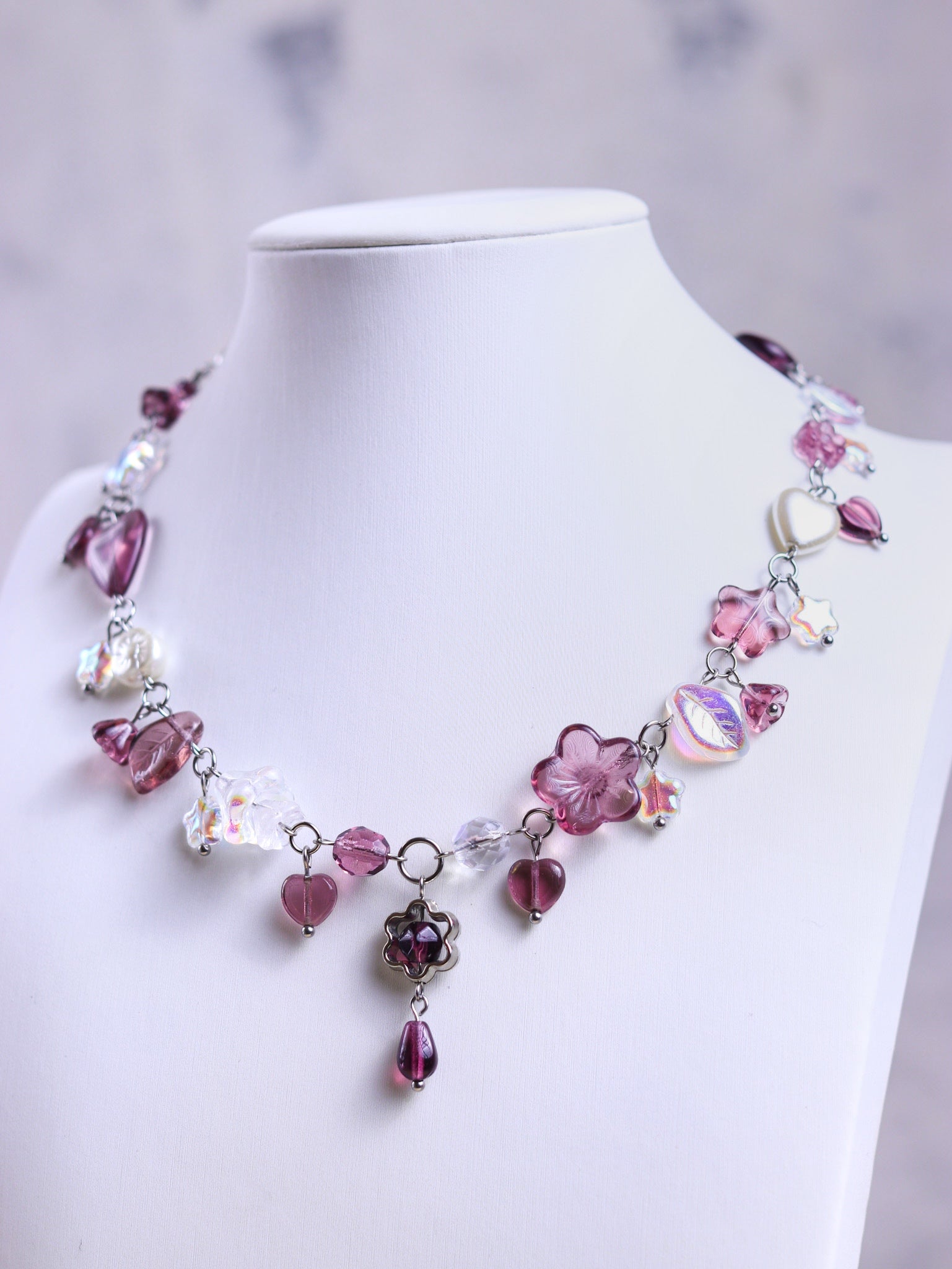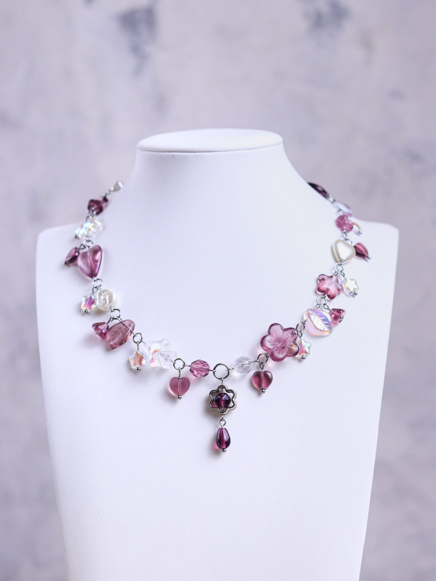 Made with high quality Czech glass beads, glass imitiation pearls and acrylic flower frames. The wire and chains are stainless steel (waterproof and tarnish-resistant).